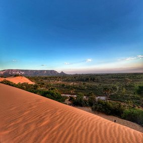 De dag start in de schaduwrijke kloof Cânion Sussuapara, waar smalle rotswanden en fijne waterdruppels een verkoelende oase vormen. Daarna bezoek je de quilombola-gemeenschap Rio Novo, waar je kennismaakt met lokale tradities en geniet van een huisgemaakte lunch. In de middag kun je ontspannen aan de Prainha, een paradijselijk strandje aan de Rio Novo. Later reis je naar de oranje duinen van Jalapão, met zicht op het indrukwekkende massief van Serra do Espírito Santo. De zonsondergang kleurt het landschap magisch. Overnachting in Mateiros.